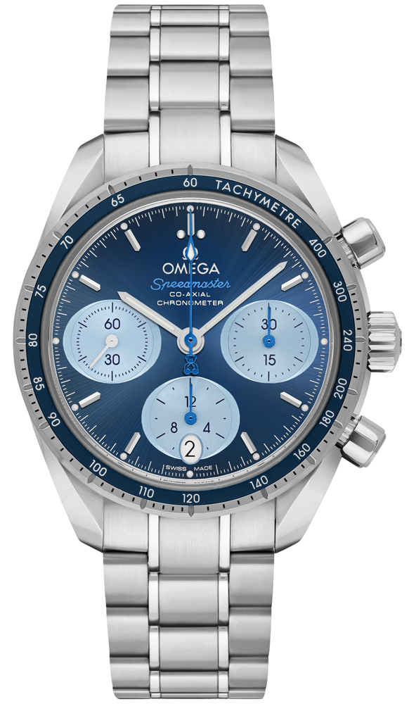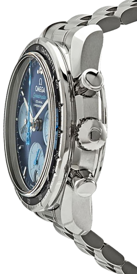 Omega Speedmaster 38 Orbis 324.30.38.50.03.002 men's watch. Orbis special edition. Features a brushed with polished stainless steel case and bracelet. Blue aluminum fixed bezel with tachymeter scale. Sun-brushed blue dial with luminescent hands and index hour markers. Date displayed in window at 6 o'clock. Chronograph with large blue central chronograph seconds hand, 30 minute counter sub-dial at 3 o'clock and 12 hour counter sub-dial at 6 o'clock. Small seconds sub-dial at 9 o'clock. Powered by the Omega Caliber 3330 self-winding automatic COSC Chronometer certified movement which boasts a 52 hour power reserve. A scratch resistant sapphire crystal with anti-reflective treatment on both sides protects the dial. The case is round and 38mm in diameter. Inlet size: 18mm. Push and pull crown. Stainless steel deployment buckle. Water resistant to 100 meters / 330 feet. Functions: hours, minutes, small seconds, date, chronograph, tachymeter. Sport watch style. Swiss made.