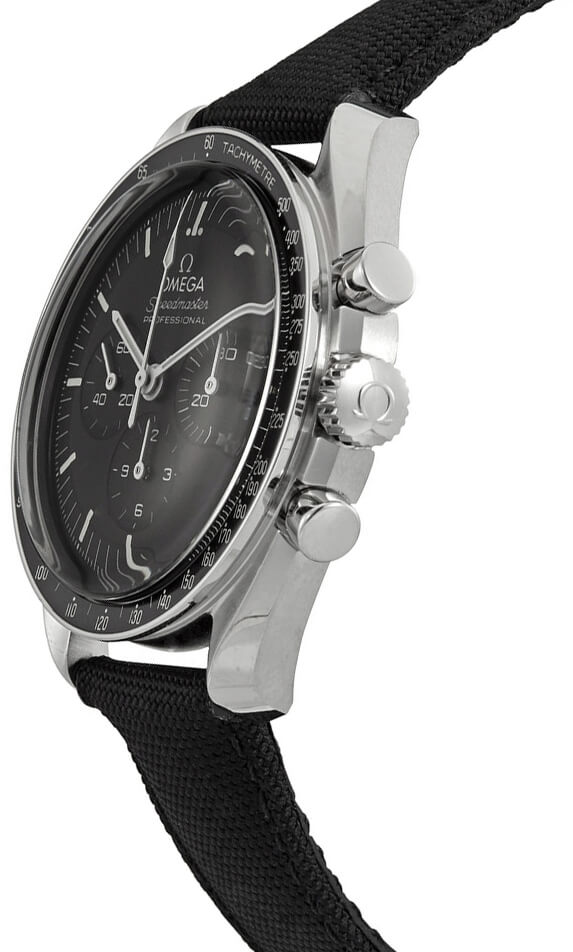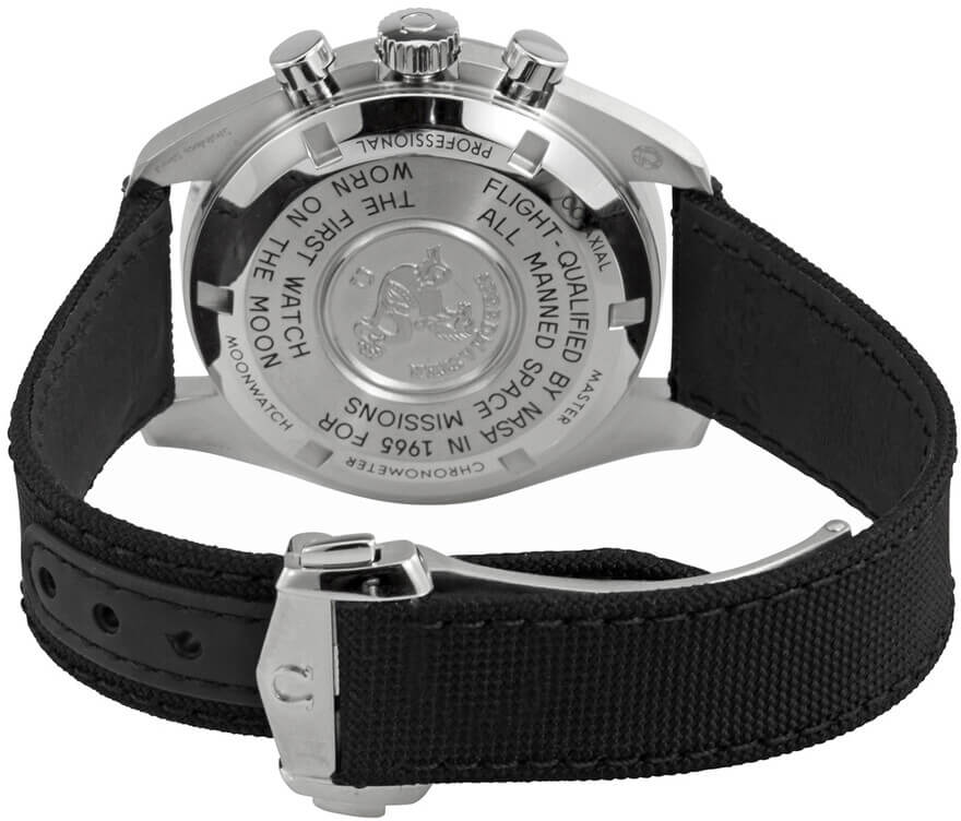 Omega Speedmaster Moonwatch Professional Co-Axial Master Chronometer Men's Watch 310.32.42.50.01.001. This 42mm watch features a stainless steel case and black nylon fabric strap with a black anodised aluminum bezel ring. The black dial has luminescent hands and hour markers and a chronograph. It is powered by the Omega Caliber 3861 manual winding COSC Master Chronometer certified movement with co-axial escapement and a 50 hour power reserve.