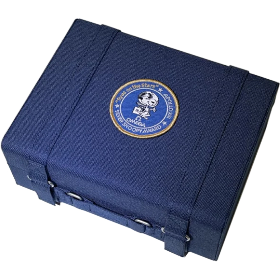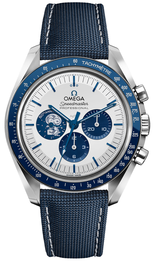 Omega Speedmaster Silver Snoopy Award Men's Watch 310.32.42.50.02.001. This limited numbered edition watch features a stainless steel case with a blue ceramic bezel and a blue coated nylon fabric strap. The silver dial is embossed with a silver Snoopy medallion in the small seconds sub-dial at 9 o'clock and has a chronograph and index hour markers. It is powered by the Omega Caliber 3861 manual winding COSC Master Chronometer certified movement with a 50-hour power reserve. This watch also has protection against magnetic fields, even those greater than 1.5 tesla (15,000 gauss).
