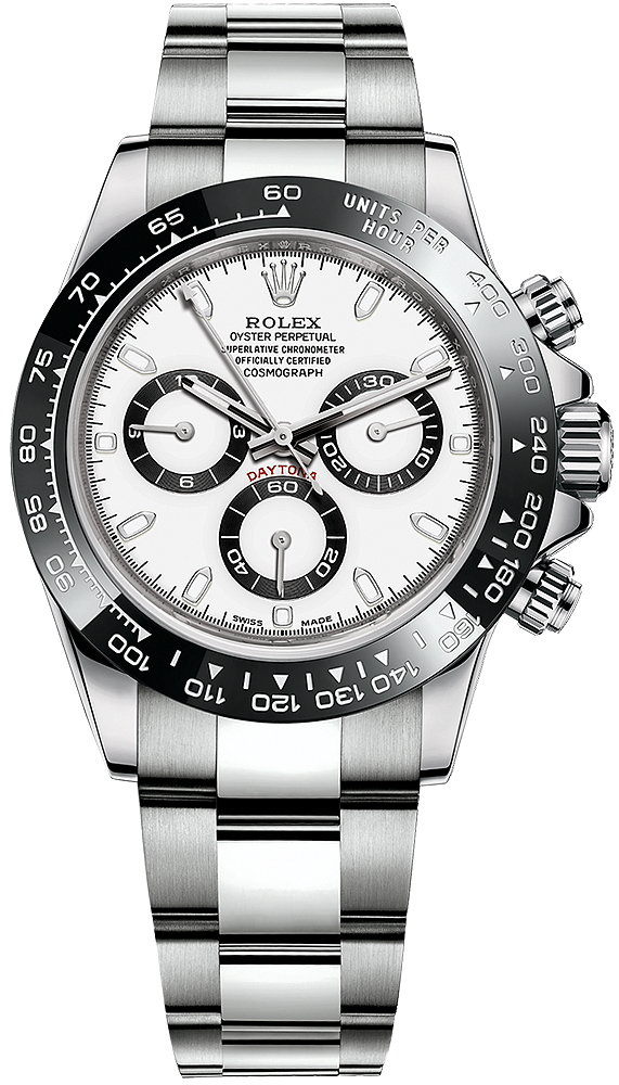 Brushed with polished Oystersteel watch case and bracelet, a part of the 904L Oystersteel Stainless Steel superalloy family used by Rolex for high technology and scratch resistance. Black Monoblock Cerachrom bezel with engraved tachymetric scale. White dial with highly legible Chromalight display featuring blue luminescent hands and hour markers. Minute markers around the rim with contrast for readability. Dial Type: Analog. Equipped with Rolex Calibre 4130 self-winding automatic movement with a 72-hour power reserve and fitted with a Parachrom hairspring for increased shock resistance and variations in temperature. 28,800 vibrations per hour. Scratch resistant sapphire crystal. Screw-down crown with Triplock triple waterproofness system with a screw-down case back and a Monobloc middle case. Case: size 40 mm, thickness 12.4 mm, round shape. Inlet size 20mm. Band width: 20 mm. Folding Oysterlock buckle clasp to prevent accidental bracelet opening and Easylink 5mm extension link for increased comfort. Waterproof up to 100 meters / 330 feet. Luxury watch style. Watch label: certified Swiss-made chronometer. Free overnight shipping and free bracelet sizing. Lowest Price Guaranteed. Rolex Daytona Cosmograph White Dial Steel Men's Watch, Model Number 116500LN.