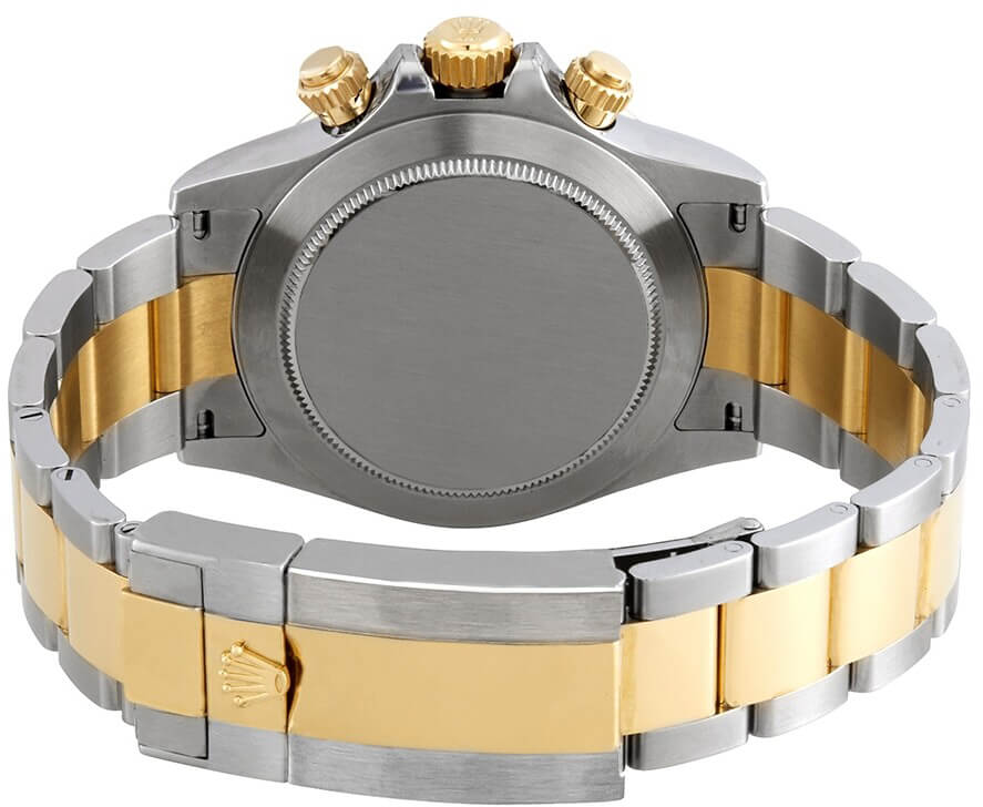 Rolex Cosmograph Daytona Men's Watch M116503-0003. This 40mm two-tone watch features an Oystersteel case with a solid 18k yellow gold bezel set with a tachymeter scale. It is fitted with a yellow gold and steel Oyster bracelet. The champagne dial has luminescent hands and index hour markers, and a chronograph feature including a small seconds sub-dial at 6 o'clock. The watch is powered by the Rolex Caliber 4130 self-winding automatic COSC Superlative Chronometer certified movement with a 72-hour power reserve.