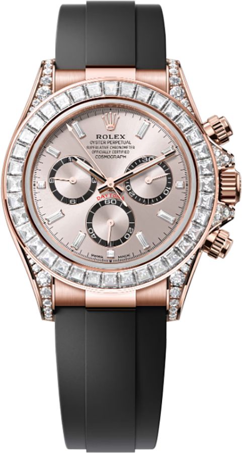 Experience the epitome of luxury and quality with the Rolex Cosmograph Daytona 126535TBR-0002. This exquisite timepiece features a stunning sundust dial adorned with baguette-cut diamond hour markers, exuding sophistication and elegance. The 40mm 18k Everose gold case is complemented by a bezel set with baguette-cut diamonds, showcasing exquisite craftsmanship. Equipped with a chronograph function and powered by an automatic movement, this watch is not only a stylish accessory but also a precise timekeeping companion. The Oysterflex bracelet with Oysterlock safety clasp ensures a secure and comfortable fit for everyday wear. Indulge in the luxury of Rolex with this remarkable chronometer.