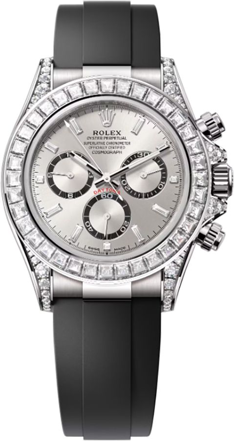 Experience the timeless elegance of the Rolex Cosmograph Daytona 126539TBR-0002. This exquisite timepiece features a steel dial adorned with baguette-cut diamond hour markers, adding a touch of luxury to its design. The chronograph function allows for precision timekeeping, while the 40mm 18k white gold case provides a sleek and sophisticated look. The case and bezel are set with baguette-cut diamonds, further enhancing its opulence. The oysterflex bracelet ensures a comfortable fit, complemented by the oysterlock safety clasp for added security. Equipped with automatic movement and certified as a chronometer, this Rolex watch combines style and functionality seamlessly.