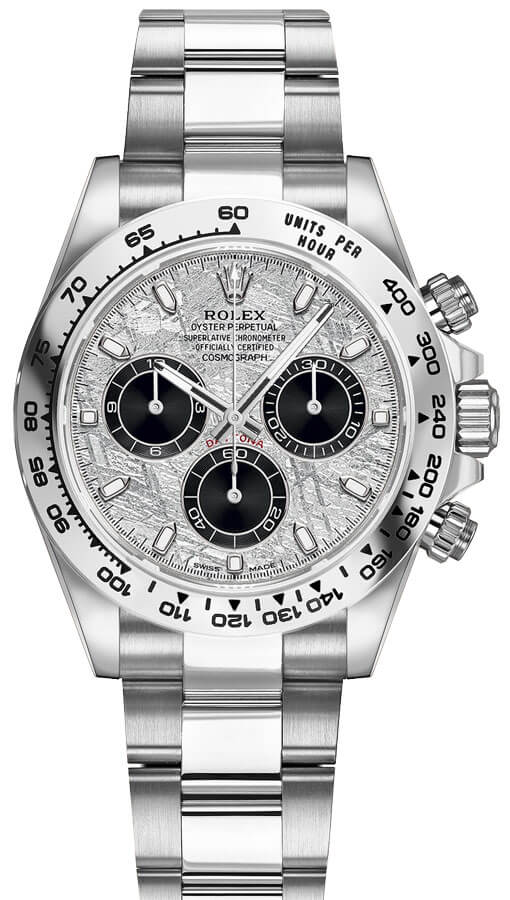 Rolex Cosmograph Daytona Men's Watch 116509-0073. This 40mm watch features a solid 18k white gold case, bezel and Oyster bracelet. The meteorite and black dial has luminescent hands and hour markers with a chronograph, small seconds, and a tachymeter scale on the bezel. It is powered by the Rolex Caliber 4130 self-winding automatic COSC Superlative Chronometer certified movement with a 72 hour power reserve.