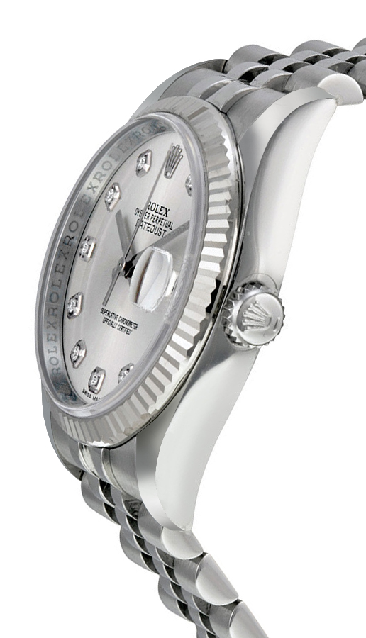 Authentic Swiss-made luxury with the Rolex Datejust 36mm Women's luxury watch model 116234-0084. A stunning silver dial is adorned with 10 diamond hour markers and a date feature located at the 3 o'clock position and surrounded by a solid 18K white gold fluted bezel. The polished 904L stainless steel case is paired with a brushed with polished 904L stainless steel jubilee bracelet with a concealed folding crownclasp deployment buckle. This beautiful watch is driven by Self-winding automatic movement with a 48-hour power reserve. You don't want to miss this deal.