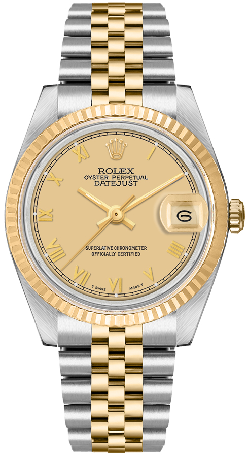 Rolex Datejust 36 men's or women's watch 16233. The champagne dial has roman numeral hour markers and a date window displayed under a cyclops lens at 3 o'clock. This watch designed for men or women features a stainless steel 36mm case with an 18k yellow gold fluted bezel and a two-tone bracelet. It is powered by the Rolex Caliber 3135 self-winding automatic COSC Superlative Chronometer certified movement with a 48-hour power reserve.