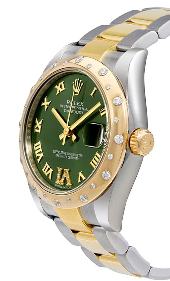 Rolex Datejust 31 278343RBR women's watch. Features a polished 904L Oystersteel stainless steel case and polished solid 18k yellow gold with brushed 904L Oystersteel stainless steel Oyster bracelet. Polished solid 18k yellow gold domed bezel set with 24 diamonds. Olive green dial with Roman numeral hour markers and diamond Roman VI. Date window displayed under cyclops lens at 3 o'clock with instantaneous date setting feature. Stop-seconds feature for precise time setting. Powered by the Rolex Caliber 2236 self-winding automatic COSC Superlative Chronometer certified movement which boasts a 55 hour power reserve, beats at 28,800 vph and contains 31 jewels. A scratch resistant sapphire crystal protects the dial. The case is round and 31mm in diameter. Screw down case back. Screw down crown with Twinlock double waterproofness system. Folding Oysterclasp deployment buckle with Easylink 5mm comfort extension link. Waterproof to 100 meters / 330 feet. Functions: hours, minutes, seconds, date. Luxury watch style. Swiss made.