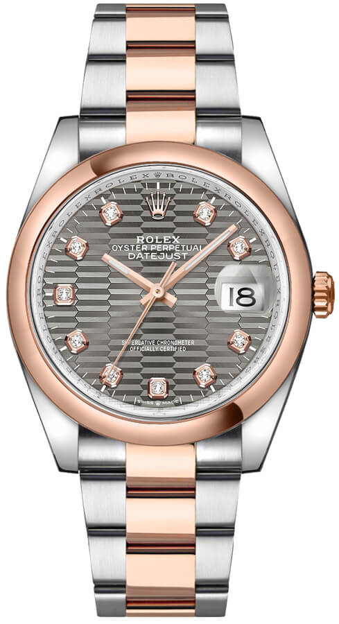The Rolex Datejust 36 is a classic timepiece that exudes luxury and style. This model's slate grey fluted motif dial is adorned with diamond hour markers, and a date window at the 3 o'clock position. The 36mm stainless steel case is topped with an 18k everose gold domed bezel, and the watch is secured to the wrist with a luxurious two-tone jubilee bracelet and oysterclasp deployment buckle. Powered by an automatic movement, this chronometer is a reliable and sophisticated choice for everyday wear and holds a power reserve of up to 70 hours.