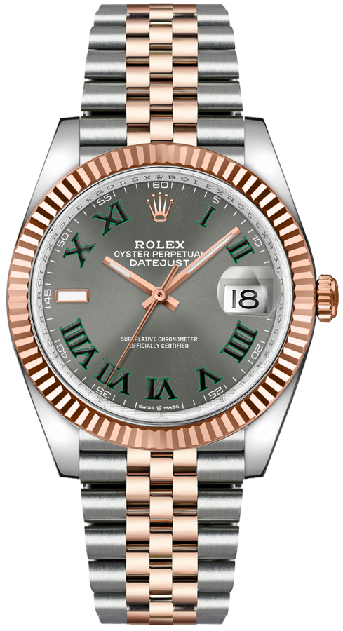 The iconic Rolex Datejust 36 126231-0029 is the perfect combination of luxury and timelessness. This stunning watch features a slate grey Wimbledon dial with black and green Roman Numeral hour markers. The date display is at 3 o'clock and the 36mm stainless steel case with 18k Everose Gold fluted bezel make it stand out. The two-tone Jubilee bracelet with oysterclasp deployment buckle make this timepiece both fashionable and comfortable to wear. Powered by an automatic, chronometer movement, this watch is sure to become an heirloom piece that you can pass down for generations.