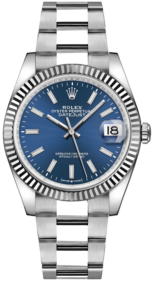 Rolex Datejust 36 126234 Luxury watch. Features a polished 904L Oystersteel stainless steel case and brushed with polished 904L Oystersteel stainless steel oyster bracelet. Polished solid 18k white gold fluted fixed bezel. Blue dial with luminescent hands and index hour markers. Date window displayed under cyclops lens at 3 o'clock with instantaneous date setting. Stop-seconds feature for precise time setting. Powered by the Rolex Caliber 3235 self-winding automatic COSC Superlative Chronometer certified movement which boasts a 70 hour power reserve and beats at 28,800 vph. A scratch resistant sapphire crystal protects the dial. The case is round and 36mm in diameter. Screw down crown with Twinlock double waterproofness system. Screw down case back. Folding Oysterclasp deployment buckle with Easylink 5mm comfort extension link. Waterproof to 100 meters / 330 feet. Functions: hours, minutes, seconds, date. Luxury watch style. Swiss made.