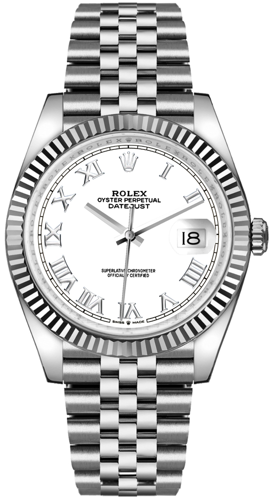 Rolex Datejust 36 126234 MEN'S OR WOMEN'S watch. Features a polished 904L Oystersteel stainless steel case and brushed with polished 904L Oystersteel stainless steel Jubilee bracelet. Polished solid 18k white gold fluted fixed bezel. White dial with Roman numeral hour markers. Date window displayed at 3 o'clock with instantaneous date setting. Stop-seconds feature for precise time setting. Powered by the Rolex Caliber 3235 self-winding automatic COSC Superlative Chronometer certified movement which boasts a 70 hour power reserve and beats at 28,800 vph. A scratch resistant sapphire crystal protects the dial. The case is round and 36mm in diameter. Screw down crown with Twinlock double waterproofness system. Screw down case back. Folding Oysterclasp deployment buckle with Easylink 5mm comfort extension link. Waterproof to 100 meters / 330 feet. Functions: hours, minutes, seconds, date. Luxury watch style. Swiss made.