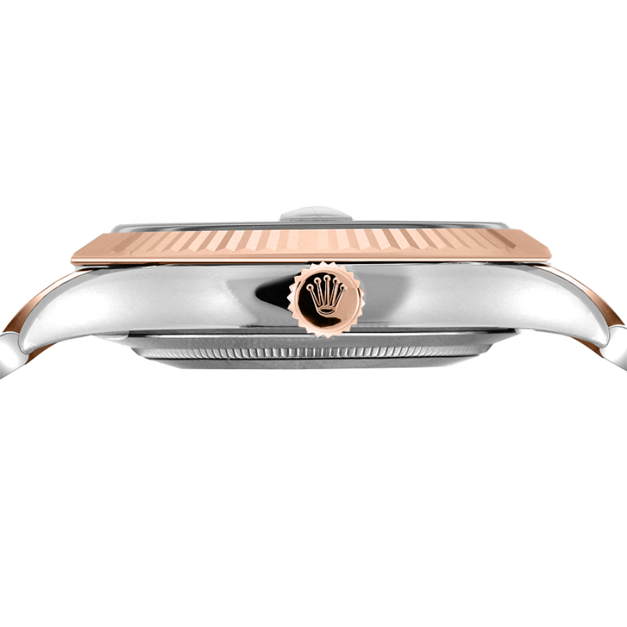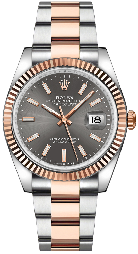 Rolex Datejust 36 126231 MEN'S OR WOMEN'S watch. Features a polished 904L Oystersteel stainless steel case and brushed 904L Oystersteel stainless steel with polished solid 18k everose gold Oyster bracelet. Polished solid 18k everose gold fluted fixed bezel. Dark Rhodium grey dial with luminescent hands and index hour markers. Date window displayed under cyclops lens at 3 o'clock with instantaneous date setting. Stop-seconds feature for precise time setting. Powered by the Rolex Caliber 3235 self-winding automatic COSC Superlative Chronometer certified movement which boasts a 70 hour power reserve, beats at 28,800 vph and contains 31 jewels. A scratch resistant sapphire crystal protects the dial. The case is round and 36mm in diameter. Screw down crown with Twinlock double waterproofness system. Screw down case back. Folding Oysterclasp deployment buckle with Easylink 5mm comfort extension link. Waterproof to 100 meters / 330 feet. Functions: hours, minute, seconds, date. Luxury watch style. Swiss made.