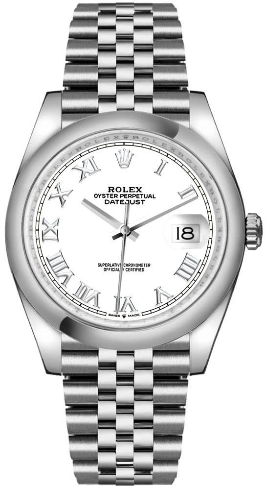 Rolex Datejust 36 126200 men's watch. Features a polished 904L Oystersteel stainless steel case and brushed with polished 904L Oystersteel stainless steel Jubilee bracelet. Polished 904L Oystersteel stainless steel domed bezel. White dial with Roman Numeral hour markers. Date window displayed under cyclops lens at 3 o'clock with instantaneous date setting. Powered by the Rolex Caliber 3235 self-winding automatic COSC Superlative Chronometer certified movement which boasts a 70 hour power reserve and beats at 28,800 vph. A scratch resistant sapphire crystal protects the dial. The case is round and 36mm in diameter. Screw down crown with Twinlock double waterproofness system. Screw down case back. Folding Oysterclasp deployment buckle with Easylink 5mm comfort extension link. Waterproof to 100 meters / 330 feet. Functions: hours, minutes, seconds, date. Luxury watch style. Swiss made.
