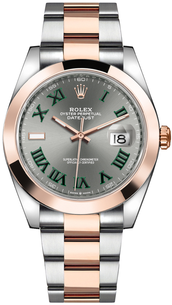 Rolex Datejust 41 126301 men's watch. Features a polished Oystersteel case and polished solid 18k everose gold with brushed Oystersteel Oyster bracelet. Polished solid 18k everose gold domed fixed bezel. Slate grey dial luminescent hands and 9 o'clock hour marker. Roman numeral hour markers. Date displayed under Cyclops lens in window at 3 o'clock with instantaneous date setting. Stop-seconds feature for precise time setting. Powered by the Rolex Caliber 3235 self-winding automatic COSC Superlative Chronometer certified movement which boasts a 70 hour power reserve, beats at 28,800 vph and contains 31 jewels. A scratch resistant sapphire crystal protects the dial. The case is round and 41mm in diameter. Inlet size: 21mm. Screw down crown with Twinlock double waterproofness system. Screw down case back. Folding Oysterclasp deployment buckle with Easylink 5mm comfort extension link. Waterproof to 100 meters / 330 feet. Functions: hours, minutes, seconds, date. Dress watch style. Swiss made.