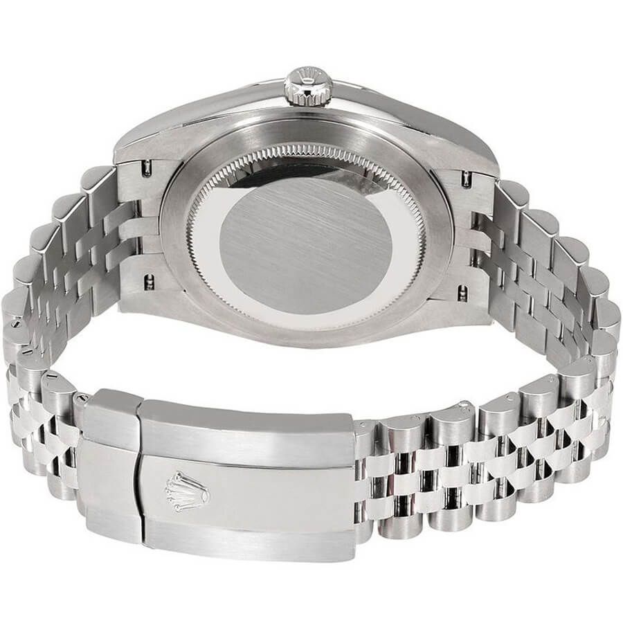 Rolex Datejust 41 126300 men's watch. Features a polished 904L Oystersteel stainless steel case and brushed with polished 904L Oystersteel stainless steel Jubilee bracelet. Polished 904L Oystersteel stainless steel smooth fixed bezel. Blue dial with Roman numeral hour markers. Date displayed under cyclops lens in window at 3 o'clock with instantaneous date setting. Stop-seconds feature for precise time setting. Powered by the Rolex Caliber 3235 self-winding automatic COSC Superlative Chronometer certified movement which boasts a 70 hour power reserve, beats at 28,800 vph and contains 31 jewels. A scratch resistant sapphire crystal protects the dial. The case is round and 41mm in diameter. Screw down crown with Twinlock double waterproofness system. Screw down case back. Folding Oysterclasp deployment buckle with Easylink 5mm comfort extension link. Waterproof to 100 meters / 330 feet. Functions: hours, minutes, seconds, date. Dress watch style. Swiss made.
