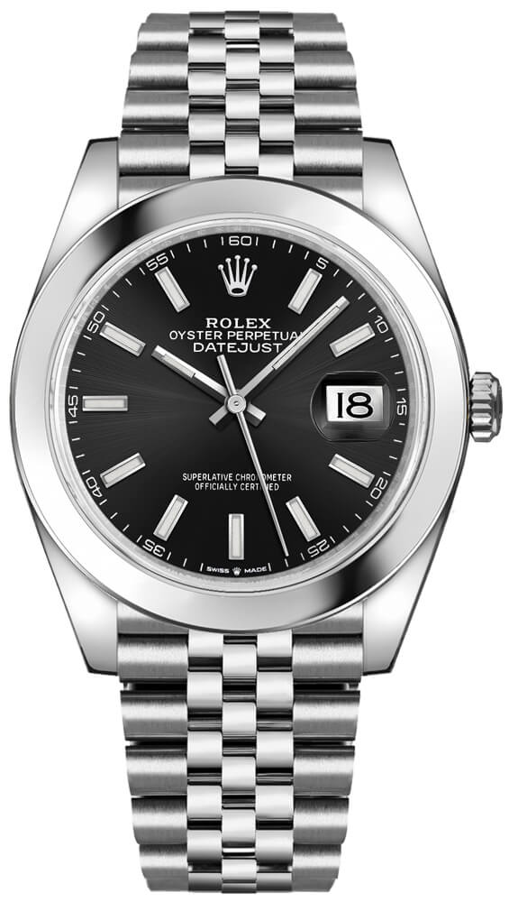 The Rolex Datejust 41 Men’s watch M126300-0012 is an authentic Swiss-made luxury watch featuring a polished with brushed 904L Oystersteel stainless steel case paired with a polished with brushed 904L Oystersteel stainless steel jubilee bracelet. The luminescent hands, hour markers and date aperture located at the 3 o’clock position are set against a black dial encompassed in a polished stainless steel bezel. This bold watch is driven by COSC Superlative Chronometer Certified Self-winding automatic movement with 70 hour power reserve.