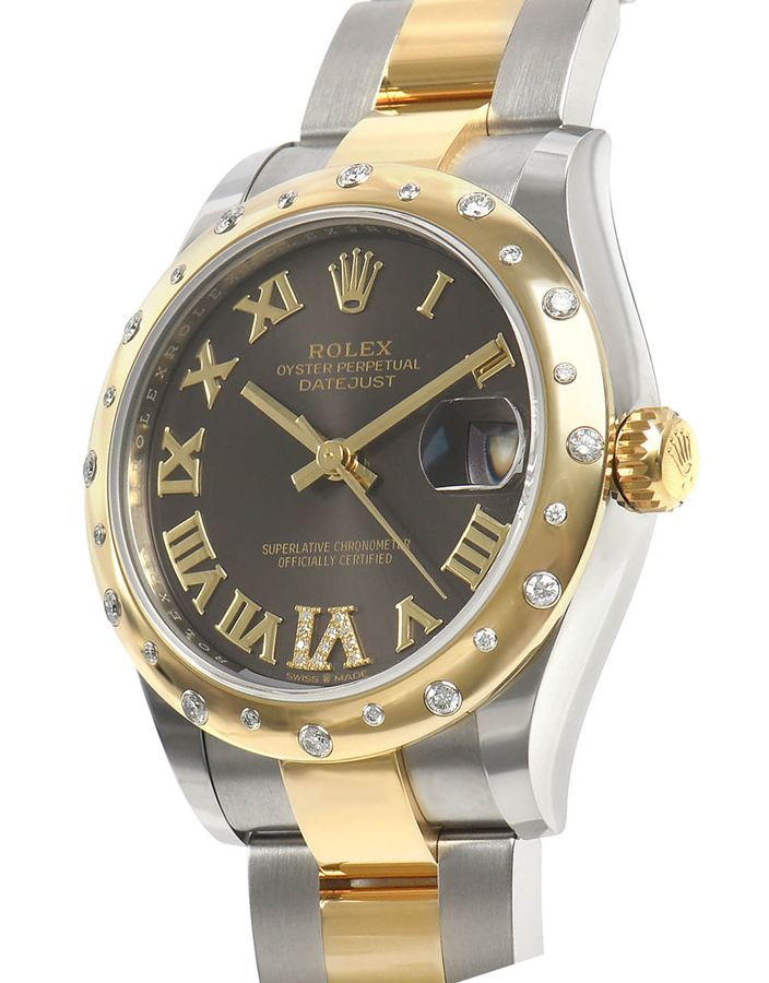 Rolex Datejust 31 278343RBR women's watch. Features a polished 904L Oystersteel stainless steel case and polished solid 18k yellow gold with brushed 904L Oystersteel stainless steel Oyster bracelet. Polished solid 18k yellow gold domed bezel set with 24 diamonds. Dark grey dial with Roman numeral hour markers and diamond Roman VI. Date window displayed under cyclops lens at 3 o'clock with instantaneous date setting feature. Stop-seconds feature for precise time setting. Powered by the Rolex Caliber 2236 self-winding automatic COSC Superlative Chronometer certified movement which boasts a 55 hour power reserve, beats at 28,800 vph and contains 31 jewels. A scratch resistant sapphire crystal protects the dial. The case is round and 31mm in diameter. Screw down case back. Screw down crown with Twinlock double waterproofness system. Folding Oysterclasp deployment buckle with Easylink 5mm comfort extension link. Waterproof to 100 meters / 330 feet. Functions: hours, minutes, seconds, date. Luxury watch style. Swiss made.