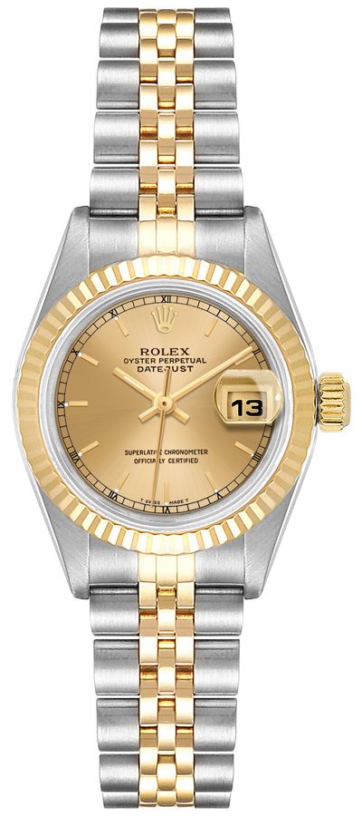 Rolex Lady-Datejust 26 Women's Watch 79173. This 26mm watch features a stainless steel case with a solid 18k yellow gold fluted bezel and a two tone Jubilee bracelet. The champagne dial has index hour markers and a date window displayed under a cyclops lens at 3 o'clock. It is powered by the Rolex Caliber 2235 self-winding automatic COSC Superlative Chronometer certified movement with a 48 hour power reserve.