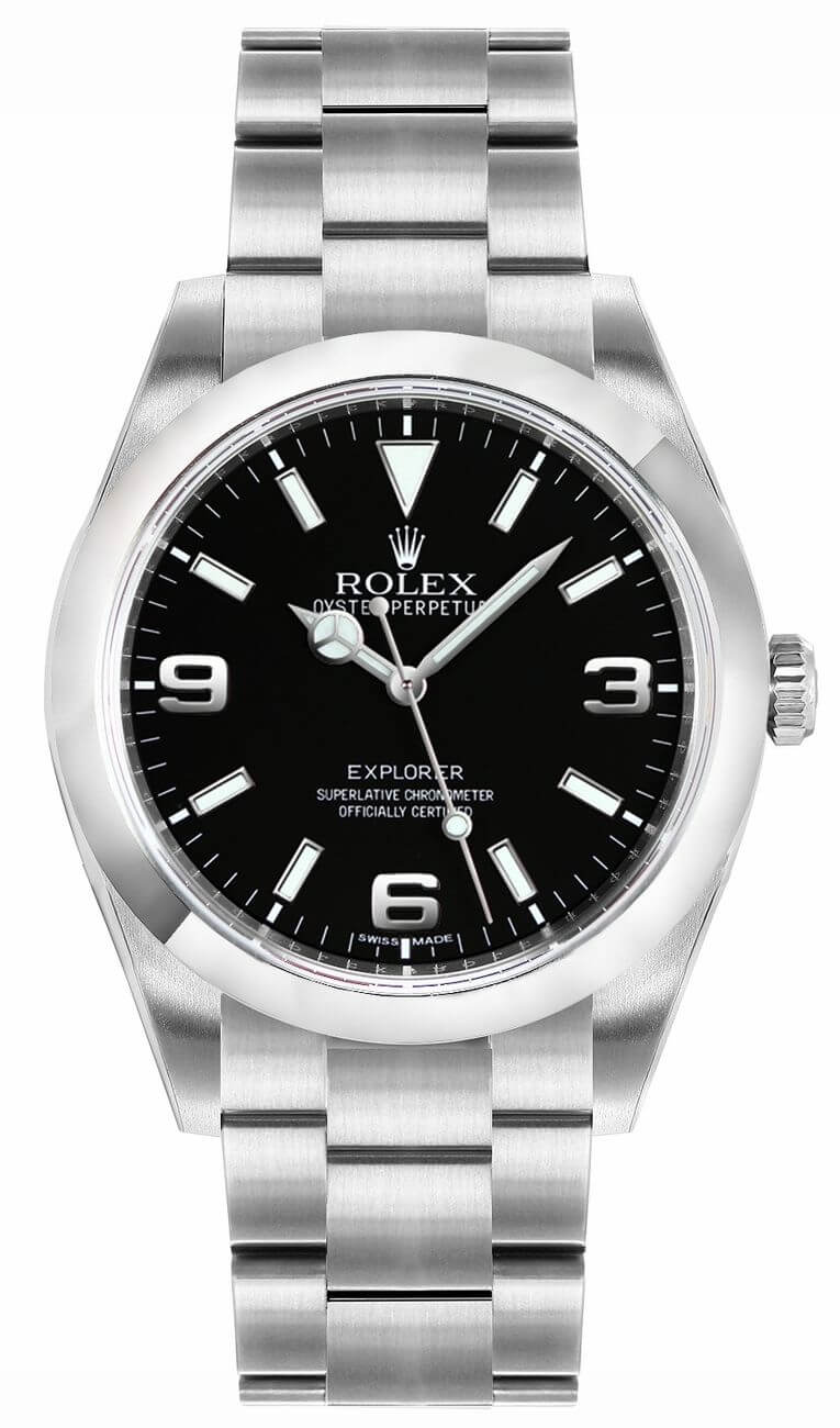 Rolex Explorer 214270 men's watch. Features a brushed with polished 904L Oystersteel stainless steel case and Oyster bracelet. Polished 904L Oystersteel stainless steel smooth bezel. Black dial with luminescent hands and index hour markers and stainless steel Arabic numeral 3, 6 and 9 o'clock hour markers. Second / minute track. Stop-seconds for precise time setting. Powered by the Rolex Caliber 3132 self-winding automatic COSC Chronometer certified movement which boasts a 48 hour power reserve, beats at 28,800 vph and contains 31 jewels. A scratch resistant sapphire crystal protects the dial. The case is round, 39mm in diameter and 13mm thick. Inlet size: 20mm. Stainless steel solid case back. Screw down crown and case back. Stainless steel deployment buckle. Water resistant to 100 meters / 330 feet. Functions: hours, minutes, seconds. Casual watch style. Swiss made.