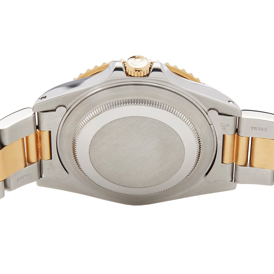 Rolex GMT-Master II 16713LN men's watch. Features a brushed with polished 904L Oystersteel stainless steel case and polished solid 18k yellow gold with brushed 904L Oystersteel stainless steel Oyster bracelet. Polished solid 18k yellow gold bidirectional rotating bezel with black insert and 24 hour engraved numerals and graduations. Black dial with luminescent hands and dot hour markers. Cyclops lens date feature with instantaneous date setting. GMT second time zone feature with independent rapid setting of the hour hand. Stop-seconds for precise time setting. Powered by the Rolex Caliber 3185 self-winding automatic COSC Chronometer certified movement which boasts a 48 hour power reserve, beats at 28,800 vph and contains 31 jewels. A scratch resistant sapphire crystal protects the dial. The case is round and 40mm in diameter. 18k yellow gold screw down crown. Stainless steel deployment buckle. Water resistant to 100 meters / 330 feet. Functions: hours, minutes, seconds, date, GMT. Luxury watch style. Swiss made.
