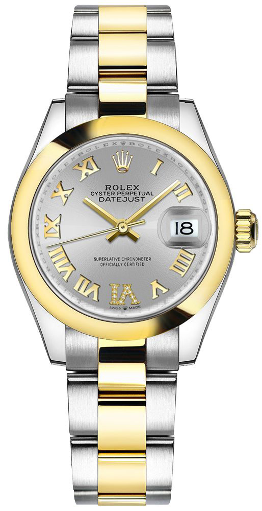 Rolex Datejust 31 278243 women's watch. Features a polished 904L Oystersteel stainless steel case and brushed 904L Oystersteel stainless steel with polished solid 18k yellow gold Oyster bracelet. Polished solid 18k yellow gold domed fixed bezel. Silver dial with Roman numeral hour markers and Roman numeral VI set with pave diamonds. Date window displayed under cyclops lens at 3 o'clock with instantaneous date setting. Stop-seconds feature for precise time setting. Powered by the Rolex Caliber 2236 self-winding automatic COSC Superlative Chronometer certified movement which boasts as 55 hour power reserve, beats at 28,800 vph and contains 31 jewels. A scratch resistant sapphire crystal protects the dial. The case is round and 31mm in diameter. Screw down crown with Twinlock double waterproofness system. Screw down case back. Folding Oysterclasp deployment buckle with Easylink 5mm comfort extension link. Waterproof to 100 meters / 330 feet. Functions: hours, minutes, seconds, date. Luxury watch style. Swiss made.