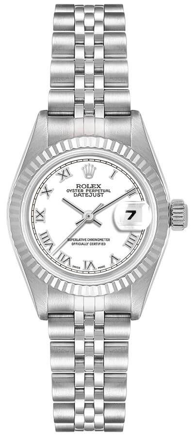 Rolex Lady-Datejust 26 Women's Watch 79174. This 26mm watch features a stainless steel case with an 18k white gold fluted bezel and a Jubilee bracelet The white dial has Roman numeral hour markers and a date window displayed under a cyclops lens at 3 o'clock. It is powered by the Rolex Caliber 2235 self-winding automatic COSC Superlative Chronometer certified movement with a 48 hour power reserve.