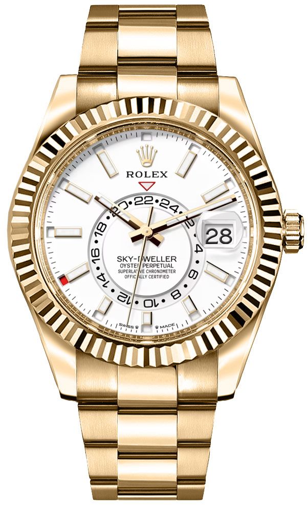 Experience the exquisite craftsmanship and timeless elegance of the Rolex Sky-Dweller 336938-0003. Featuring a stunning white dial with index hour markers, this luxury timepiece boasts an annual calendar and a GMT second time zone function for added convenience. The 42mm 18k yellow gold case is paired with a bidirectional rotating fluted bezel and an oyster bracelet with oysterclasp, ensuring both style and durability. Powered by an automatic movement certified as a chronometer, this Rolex watch is a true masterpiece of precision engineering. Elevate your wristwear collection with the sophistication of the Rolex Sky-Dweller 336938-0003.