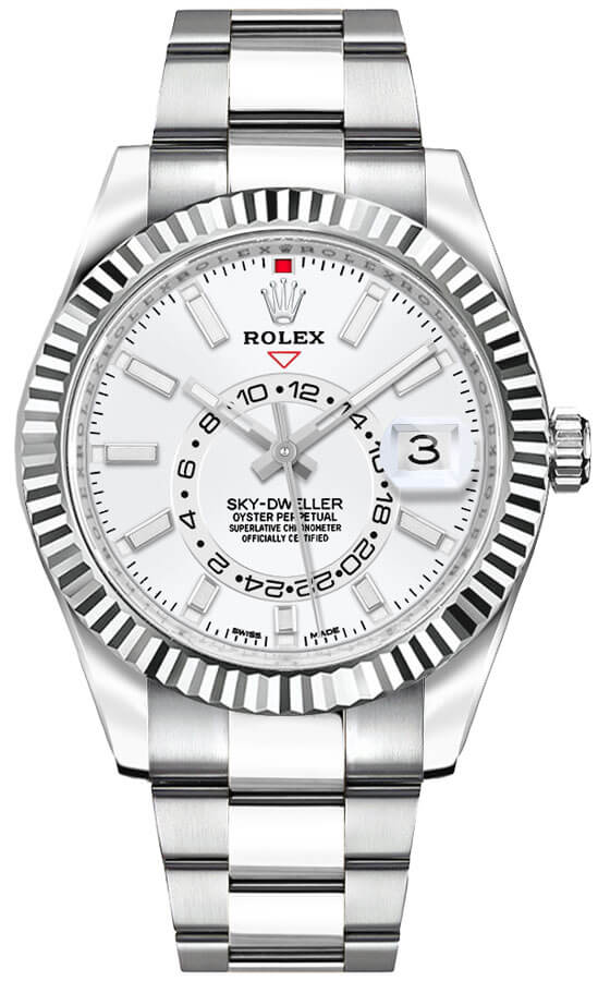 The Rolex Sky-Dweller 326934-0001 is a luxurious and high quality timepiece from the world-renowned watchmaker. Featuring a white dial with index hour markers, this model also includes an annual calendar and GMT second time zone display, making it perfect for the well-traveled individual. The 42mm stainless steel case is complimented by an 18k white gold fluted bezel, giving it a sophisticated look. The oyster bracelet with folding oysterclasp ensures that this watch stays securely on your wrist. Powered by an automatic chronometer-certified movement, this watch will keep you on time no matter where you go. With its combination of design and functionality, the Rolex Sky-Dweller 326934-0001 is sure to make a statement wherever you go.