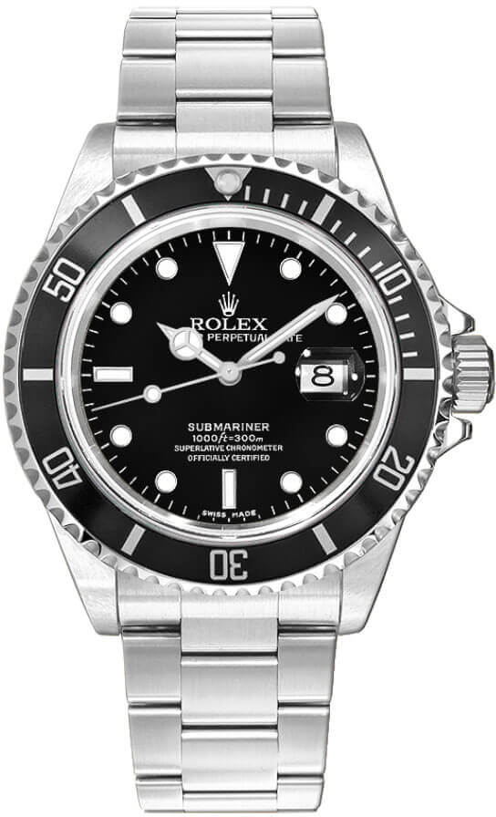 Rolex Submariner Date men's vintage watch 16800. This 40mm watch features a 904L stainless steel oystersteel case and Oyster bracelet. The black dial has luminous hour markers with a date window displayed under a cyclops lens at 3 o'clock. It is powered by the Rolex Caliber 3035 self-winding automatic COSC Superlative Chronometer certified movement with a 48 hour power reserve.