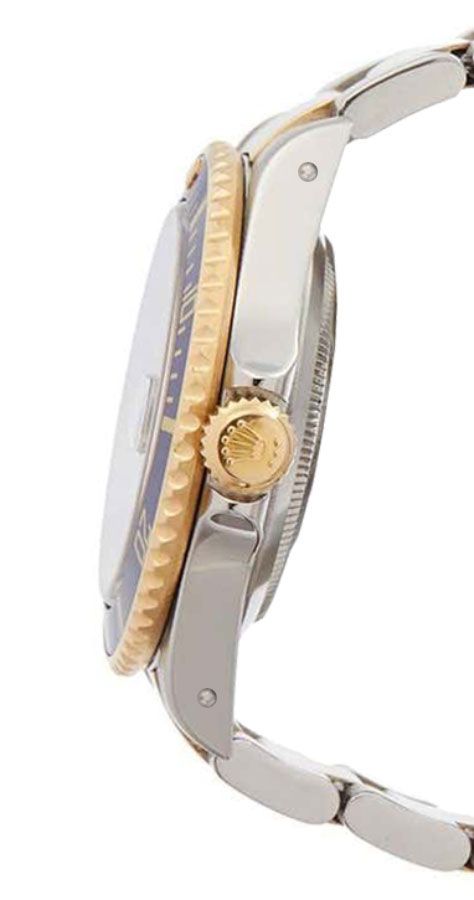 Rolex Submariner Date 16613LB men's watch. Features a polished with brushed 904L Oystersteel stainless steel case and Oyster bracelet. Blue unidirectional rotating bezel insert with engraved 60 minute scale and graduations. Blue dial with dot hour markers. Date displayed under cyclops lens in window at 3 o'clock with instantaneous date setting. Powered by the Rolex Caliber 3135 self-winding automatic COSC Superlative Chronometer certified movement which boasts a 48 hour power reserve, beats at 28,800 vph and contains 31 jewels. A scratch resistant sapphire crystal protects the dial. The case is round and 40mm in diameter. Inlet size: 13mm. Solid case back. Screw down crown and case back. Stainless steel deployment buckle. Waterproof to 300 meters / 1000 feet. Functions: hours, minutes, seconds, date. Diving watch style. Swiss made.