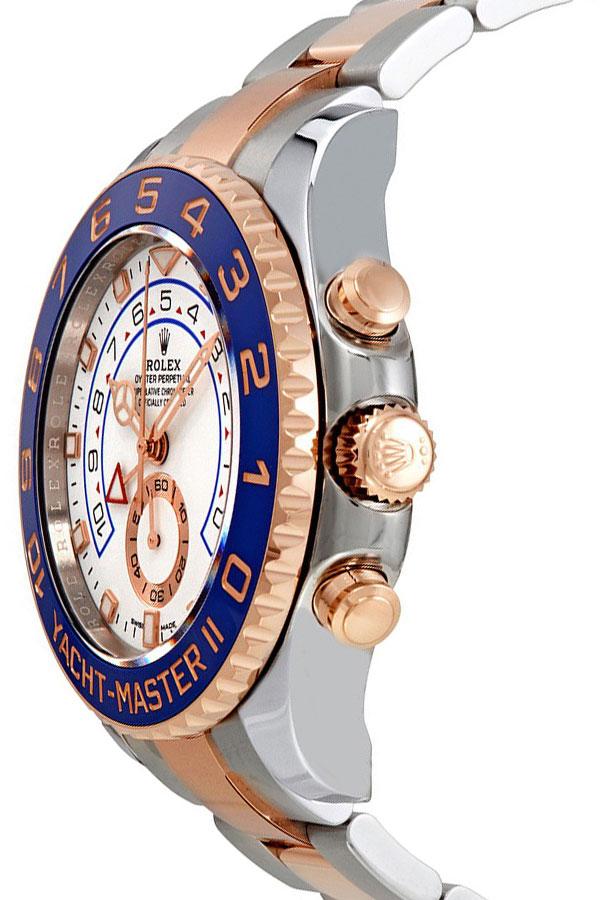 Rolex Yacht-Master II 116681 men's watch. Features a polished Solid 18k Everose Gold with 904L Oystersteel stainless steel case. Polished Solid 18k Everose Gold with brushed 904L Oystersteel stainless steel Oyster bracelet. Polished Solid 18k Everose Gold 90 degree bidirectional rotating Ring Command bezel with blue Cerachrom ceramic insert and gold coated numerals. White dial featuring highly legible Chromalight display with long-lasting blue luminescence. Square hour markers. Regatta chronograph featuring programmable countdown with mechanical memory and on-the-fly synchronization. Small seconds sub-dial at 6 o'clock. Stop-seconds for precise time setting. Powered by the Rolex calibre 4161 self-winding automatic COSC Chronometer certified movement which boasts a 72 hour power reserve and beats at 28,800 vph. A scratch resistant sapphire crystal protects the dial. The case is round and 44mm in diameter. Screw down crown with triplock triple waterproofness system. Screw down case back. Folding Oysterlock safety clasp with Easylink 5mm comfort extension link. Waterproof to 100 meters / 330 feet. Functions: hours, minutes, small seconds, regatta chronograph. Luxury watch style. Swiss made.