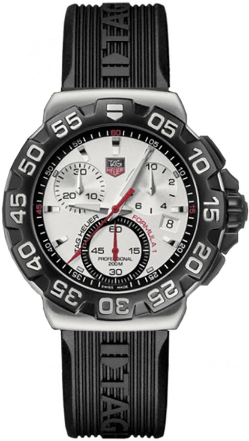 The TAG Heuer Formula 1 CAH1111.BT0714 is a sporty, quartz-powered chronograph watch featuring a bold 41mm stainless steel case and a durable black rubber strap. Designed for precision and performance, it includes a silver dial with luminous hands and markers, three sub-dials for chronograph functionality, and a date display between 3 and 4 o'clock. Its unidirectional rotating bezel, scratch-resistant sapphire crystal, and 200-meter water resistance make it both stylish and highly functional - ideal for active lifestyles and motorsport enthusiasts.