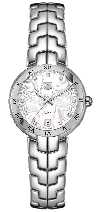 Tag Heuer Link WAT1311.BA0956 women's watch. Cameron Diaz advertised piece. Features a polished stainless steel case and bracelet. Polished stainless steel bezel engraved with Roman numeral markers. Silver guilloche dial with 11 diamond hour markers with total diamond weight of 0.10 Carat. Date window displayed at 6 o'clock. End of life indicator. Powered by a battery operated quartz movement. A scratch resistant sapphire crystal protects the dial. The case is round, 34.5mm in diameter and 10mm thick. Solid case back. Push and pull crown. Stainless steel deployment buckle. Water resistant to 100 meters / 330 feet. Functions: hours, minutes, seconds, date. Casual watch style. Swiss made.