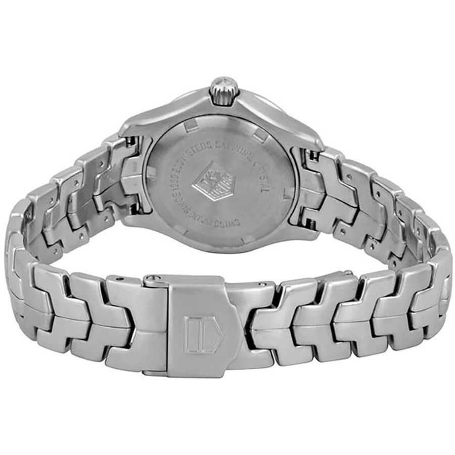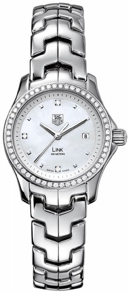 The TAG Heuer Link WJF1318.BA0572 is a women's luxury watch featuring a 27mm polished stainless steel case and bracelet, ideal for smaller wrists. It showcases a white mother-of-pearl dial set with diamond hour markers, combining elegance with functionality. Powered by a precise Swiss quartz movement, it includes a date window at 3 o’clock and a stunning diamond-set bezel. The watch is water-resistant up to 200 meters and protected by a scratch-resistant sapphire crystal, making it both stylish and durable.