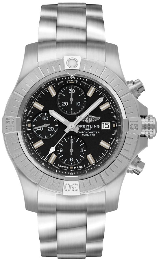 Breitling Avenger Chronograph 43 Men's Watch A13385101B1A1. This 43mm watch features a stainless steel case and bracelet with deployment buckle. The black dial has luminescent hands and hour markers with a chronograph, a date window displayed at 3 o'clock, and a small seconds sub-dial at 9 o'clock. It is powered by the Breitling Caliber B13 self-winding automatic COSC Chronometer certified movement with a 48 hour power reserve.
