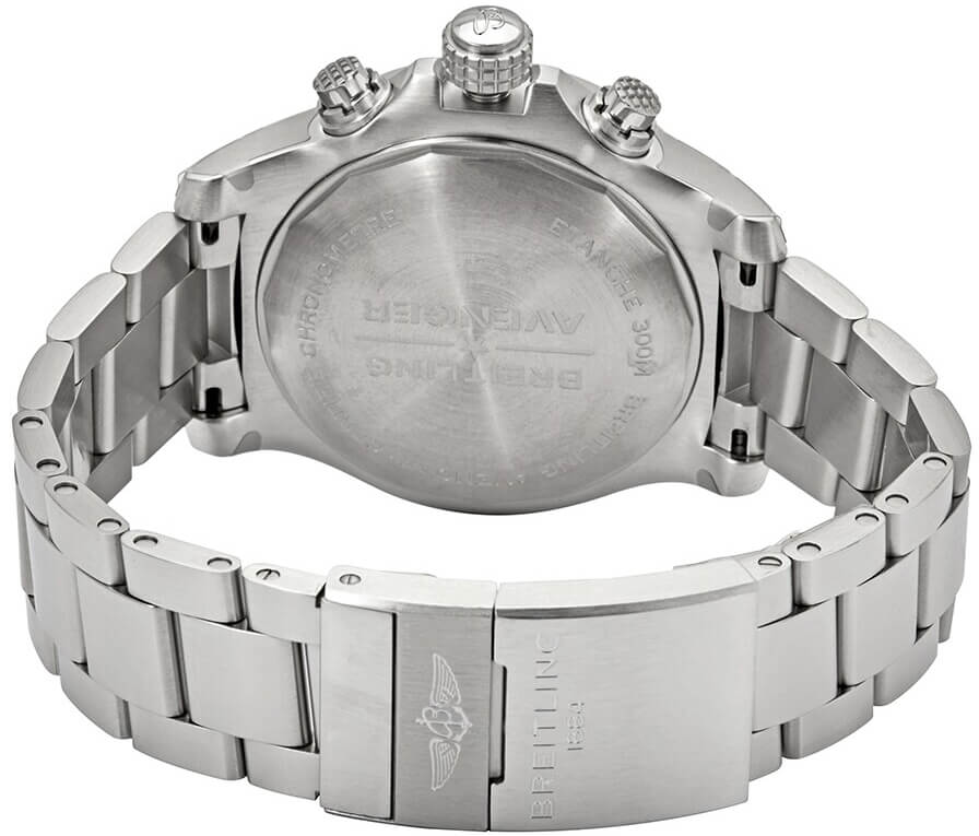 Breitling Avenger Chronograph 45 Men's Watch A13317101C1A1. This 45mm watch features a brushed stainless steel case and bracelet. The blue dial has luminescent hands and hour markers, a date window at 3 o'clock, a chronograph feature, and a small seconds sub-dial at 9 o'clock. It is powered by the Breitling Caliber 13 self-winding automatic COSC Chronometer certified movement with a 48 hour power reserve.