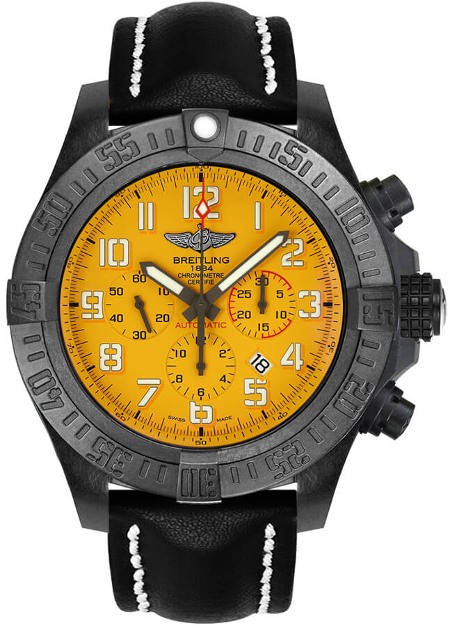 Breitling Avenger Hurricane XB0170E4/I533-441X men's watch. Features a matte black polymer case and a black leather strap, Matte black unidirectional rotating polymer bezel engraved with minute markers. Cobra yellow dial with luminescent hands and Arabic hour markers. Date displayed in dial aperture between 4 and 5 o'clock. Chronograph with large red tipped central chronograph 1/4 seconds hand, 30 minute counter sub-dial at 3 o'clock and 12 hour counter sub-dial at 6 o'clock. Small seconds sub-dial at 9 o'clock. Powered by the Breitling Caliber 01 self-winding automatic COSC Chronometer certified movement which boasts a 70 hour power reserve, beats at 28,800 vph and contains 47 jewels. A scratch resistant glareproof sapphire crystal protects the dial. The case is round, 50mm in diameter, weighs 100.0g and is 16.97mm thick. Inlet size: 24mm. Screw down crown and case back. Black polymer tang buckle. Water resistant to 100 meters / 330 feet. Functions: hours, minutes, small seconds, date, chronograph. Sport watch style. Swiss made.