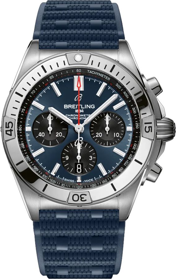 Experience superior craftsmanship and precision with the Breitling Chronomat B01 42 AB0134101C1S1. This exquisite timepiece features a stunning blue and black dial adorned with index hour markers, a date display, chronograph functions, and a tachymeter scale. The 42mm stainless steel case houses a sophisticated automatic movement that is certified as a chronometer for its exceptional accuracy. With a unidirectional rotating bezel and a comfortable blue rubber strap secured with a folding clasp, this Breitling Chronomat effortlessly combines style and functionality. Elevate your wrist game with this exceptional timepiece from Breitling.