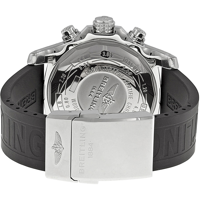 Breitling Super Avenger II A1337111/BC29-155S men's watch. Features a polished stainless steel case and black Diver Pro III rubber strap. Brushed stainless steel unidirectional rotating bezel engraved with Arabic numerals and indexes. Volcano black dial with silver sub-dials. Luminescent hands and index hour markers. Minute markers and 1/100th of a second scale around the outer rim. Date window displayed at 3 o'clock. Chronograph with large red-tipped chronograph seconds hand, 30 minute counter sub-dial at 12 o'clock and 12 hour counter sub-dial at 6 o'clock. Small seconds sub-dial at 9 o'clock. Powered by the Breitling Caliber 13 self-winding automatic COSC Chronometer certified movement which boasts a 42 hour power reserve, beats at 28,800 vph and contains 25 jewels. A scratch resistant glareproof sapphire crystal protects the dial. The case is round, 48mm in diameter, weighs 150.10g and is 17.75mm thick. Inlet size: 24mm. Stainless steel solid screw down case back. Screwed-in pushpiece guards. Screw down crown with non-slip grip and two gaskets. Stainless steel deployment buckle. Water resistant to 300 meters / 1000 feet. Functions: hours, minutes, small seconds, date, chronograph. Sport watch style. Swiss made.