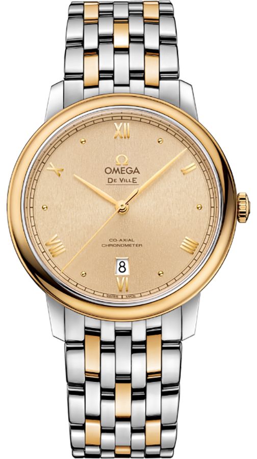 Enhance your wrist with the timeless sophistication of the Omega De Ville Prestige 424.20.40.20.08.002 timepiece. This exquisite watch features dot and Roman numeral hour markers on a striking gold dial, complemented by a functional date display. The 39.5mm stainless steel case is accented with an 18k yellow gold bezel for a touch of luxury. The two-tone bracelet with a deployment buckle ensures a comfortable and secure fit. Powered by an automatic movement certified as a chronometer, this watch seamlessly blends style and precision. Elevate your everyday look with the Omega De Ville Prestige.