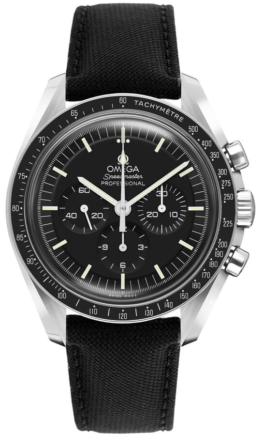 Omega Speedmaster Moonwatch Professional Co-Axial Master Chronometer Men's Watch 310.32.42.50.01.001. This 42mm watch features a stainless steel case and black nylon fabric strap with a black anodised aluminum bezel ring. The black dial has luminescent hands and hour markers and a chronograph. It is powered by the Omega Caliber 3861 manual winding COSC Master Chronometer certified movement with co-axial escapement and a 50 hour power reserve.