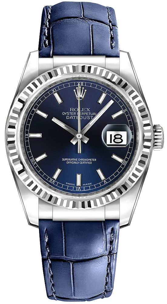 The Authentic Swiss-made Rolex Datejust 36mm Unisex Luxury watch model 116139. Featuring a solid 18K white gold case with screw-down crown & case back and a patterned blue leather strap with a solid 18K white gold deployment buckle, this watch is guaranteed to turn heads. A stunning blue dial is embellished with luminescent hands & index hour markers and a date feature at the 3 o’clock position under a scratch-resistant sapphire crystal and surrounded by a solid 18K white gold fluted bezel. This must-have watch is driven by Rolex Caliber 3135 and has a 48-hour power reserve.