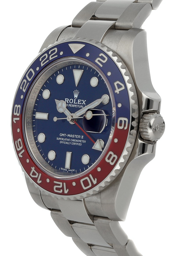Rolex GMT-Master II 126719BLRO men's watch. Features a brushed and polished solid 18k white gold case and Oyster bracelet. The bidirectional rotating bezel features a blue and red Cerachrom ceramic bezel insert with engraved numerals and 24-hour graduations. The blue dial features a highly legible Chromalight display with long-lasting blue luminescence in the hands, dots, and index hour markers. The date is displayed at 3 o'clock and magnified under a Cyclops lens and features instantaneous date setting. A second time zone is trackable with a 24 hour red GMT hand that features independent rapid-setting. Stop-seconds feature for precise time setting. Powered by the Rolex caliber 3186 self-winding automatic COSC Chronometer certified movement which boasts a 48-hour power reserve, beats at 28,800 vph, contains 31 jewels, and is equipped with a Paramagnetic blue Parachrom hairspring which offers greater resistance to shocks and temperature variations. A scratch-resistant sapphire crystal protects the dial. The case is round and 40 mm in diameter. Screw down crown with Triplock triple waterproofness system. The case back is screwed down. Stainless Steel folding Oysterlock safety clasp with Easylink 5 mm comfort extension link. Waterproof to 100 meters / 330 feet. Functions: hours, minutes, seconds, date, GMT. Luxury watch style. Swiss Made.